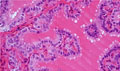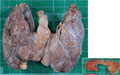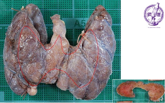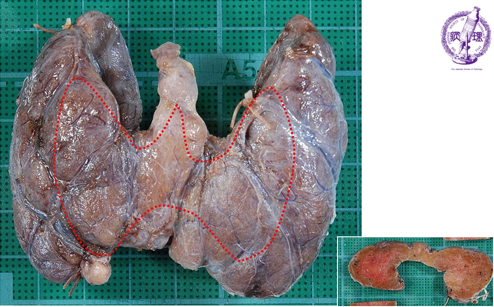 Macroscopic findings. The thyroid gland is diffusely enlarged, with 20-25mm in thickness of bilateral lobes (cut surface). The Dotted -line indicates the size of the normal thyroid gland.