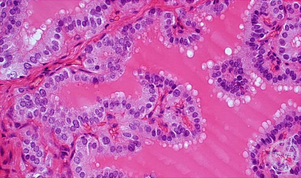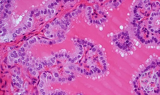 Microscopic findings (HE stain, high power view). Follicular cells are high-columnar in appearance and form papillary structures. Scalloped (gmoth-eatenh) colloids are also visible.