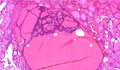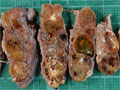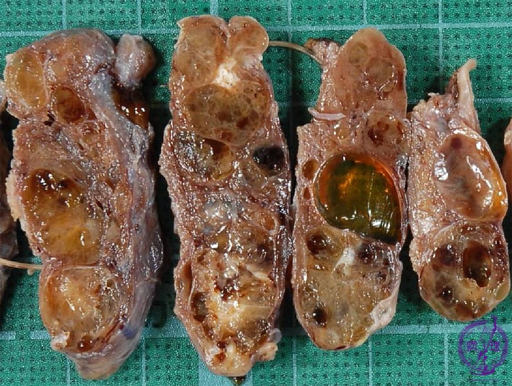 Macroscopic findings. Cut surface reveals the presence of multiple nodules with variable sizes and cystic changes.