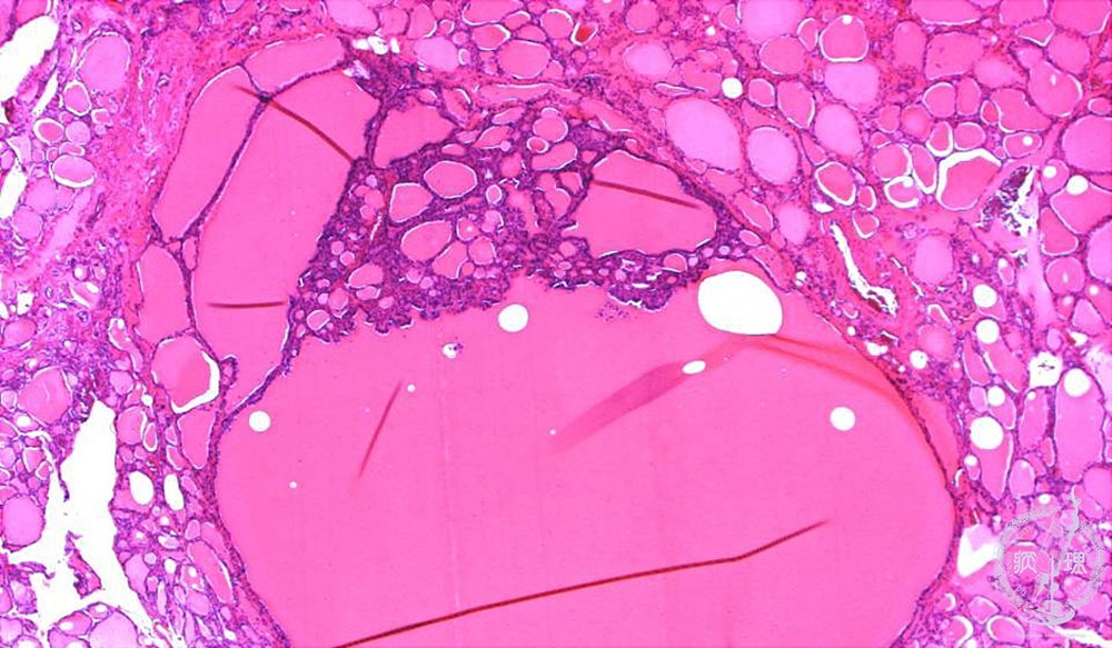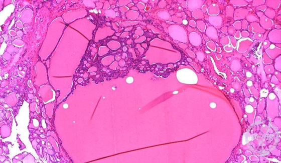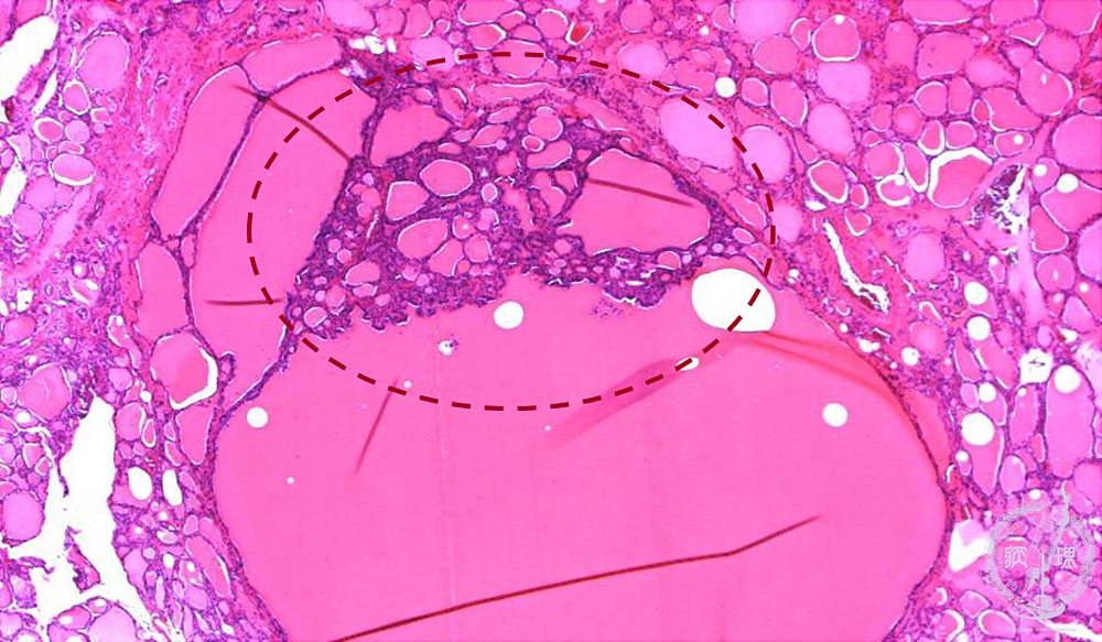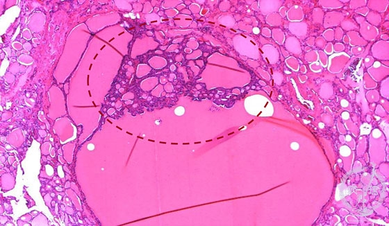 Microscopic findings (HE stain, low power view): Projection of small follicles into large follicular space (dotted -line), also called “Sanderson polster”, is characteristic of nodular goiter.
