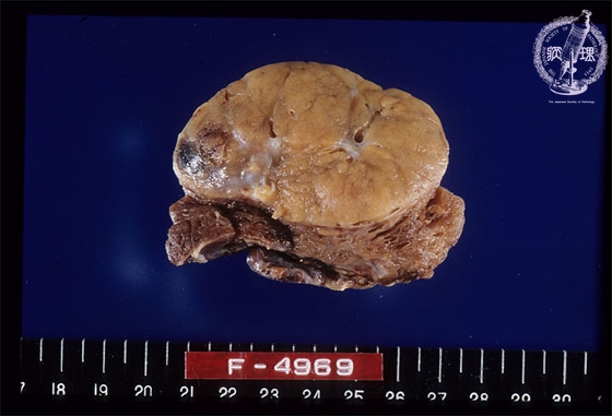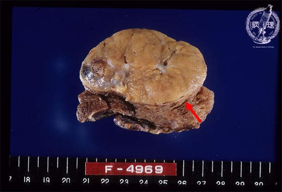 Macroscopic findings. Cut surface reveals relatively well-circumscribed, white-yellowish, nodule with fibrous capsule (arrows).