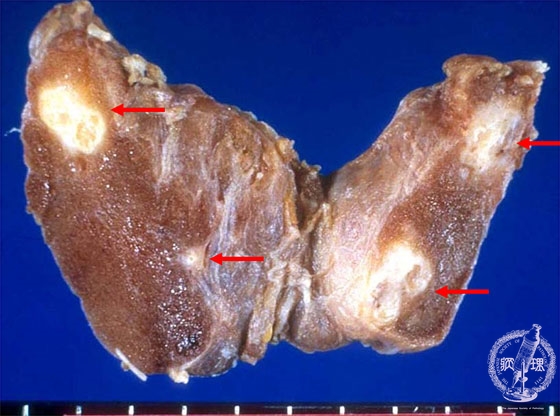 Macroscopic findings. Multiple irregular nodules (arrows) of papillary carcinoma are considered due to multicentric occurrence and/or intrathyroidal metastases.