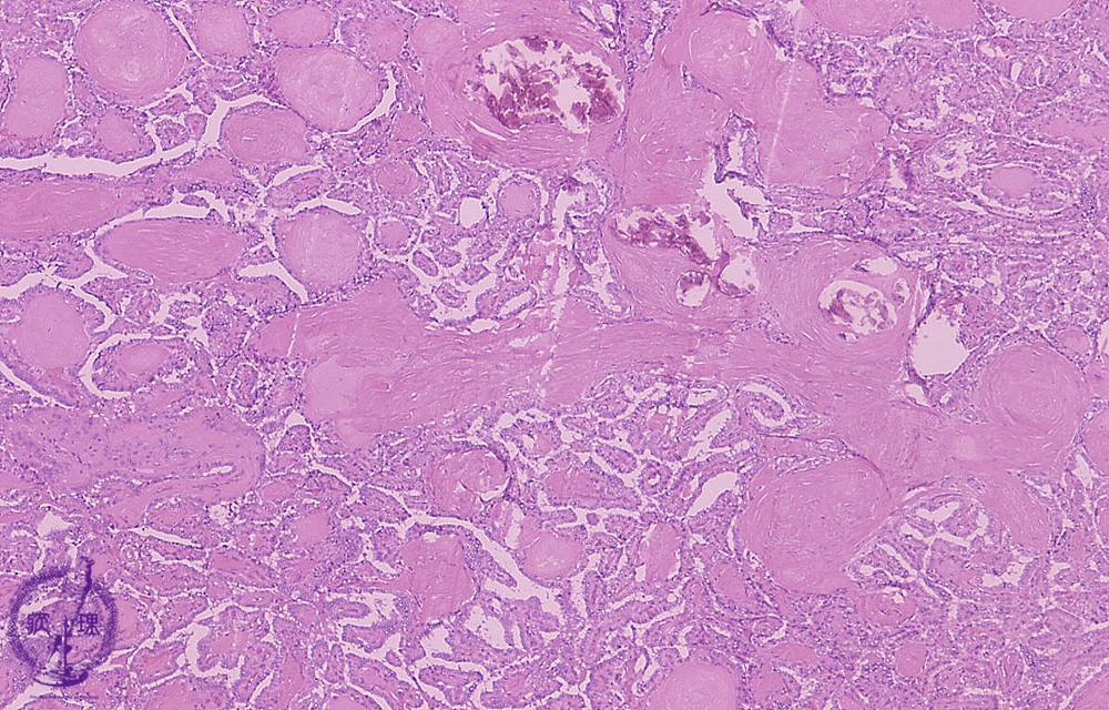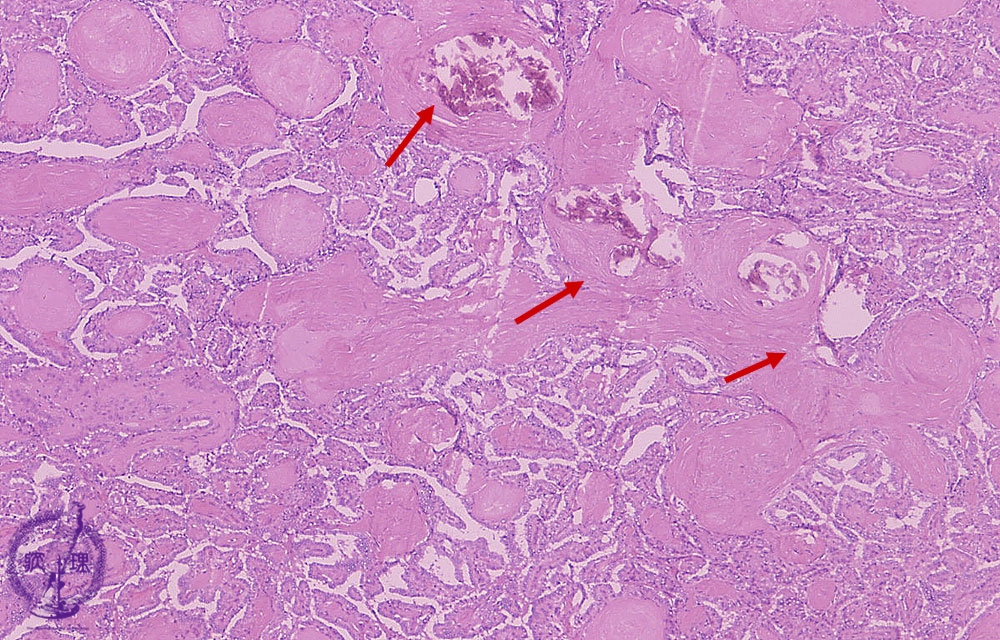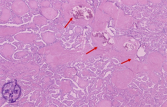 Microscopic findings (HE stain, low power). Papillary structures of tumor cells and calcification (arrows)
