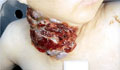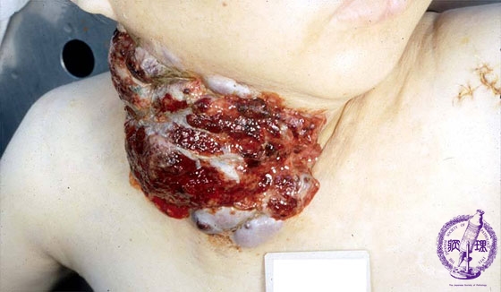Macroscopic findings. Autopsy case. The thyroid tumor rapidly proliferating and invading into the skin around the neck. This is a typical example of a highly malignant tumor