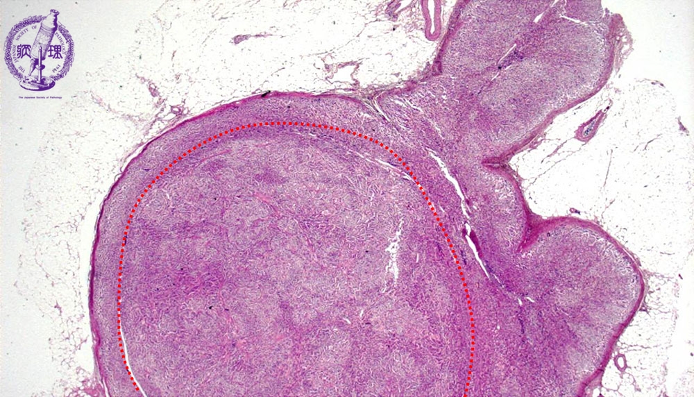 Microscopic findings (HE stain, low power view). The nodule (dotted line) located in adrenal cortex. The boundary between the nodule and normal adrenal cortex is unclear.