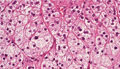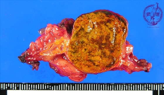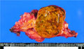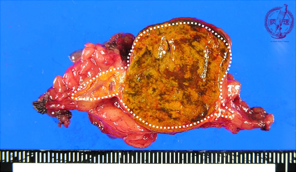 Macroscopic findings. Cut surface of the adrenal tumor demonstrates a mixture of yellowish and brownish components. Dotted line indicates the adrenal gland including adenoma.