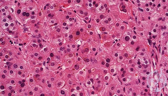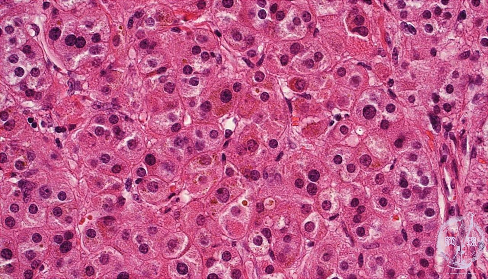 Microscopic findings (HE stain, high power view). Compact cells, with relatively high N/C ratio, demonstrated eosinophilic cytoplasm. The cells have a brownish hue due to the presence of lipofuscin granules.