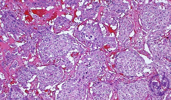 Microscopic findings (HE stain, middle power of view). The tumor cell nests surrounded by fibrovascular septa (also termed as gZellballenh), represent the characteristic architectural pattern of pheochromocytoma or intraadrenal parganglioma.