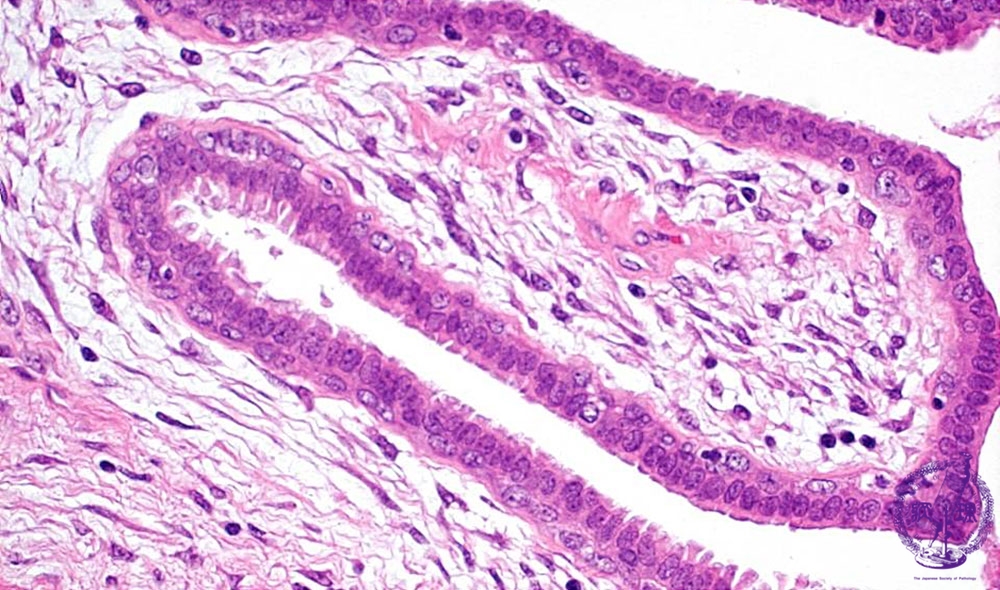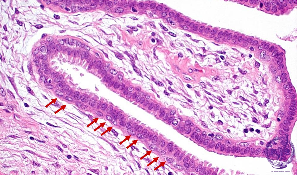 Microscopic image(HE stain, high power view):Tumor maintained distinctive bilayers of epithelial cells; 1)luminal columnar and 2) basal cells with clear cytoplasm (arrow). This finding usually suggestes a lesion that is benign in nature.