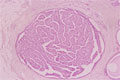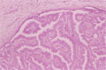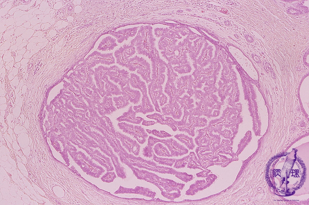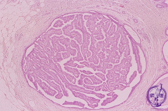 Microscopic image(HE stain, low power view):In mammmary ducts, tumor epithelium forms a projected papillary structure with fibrous core.