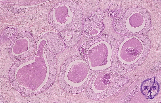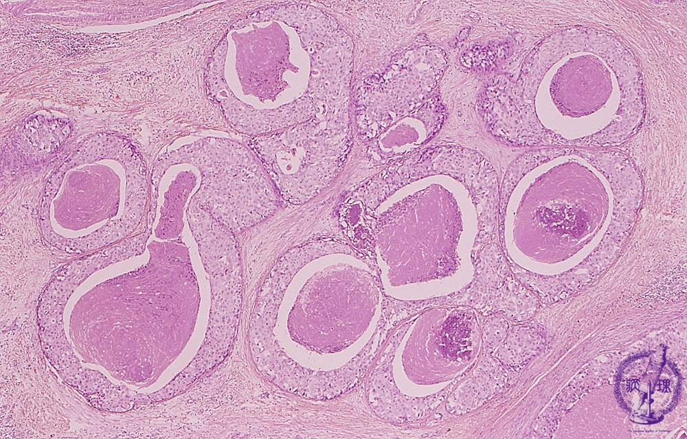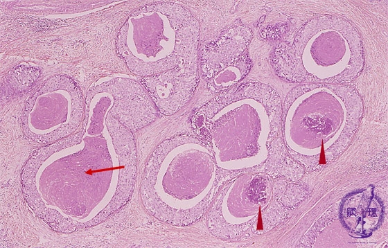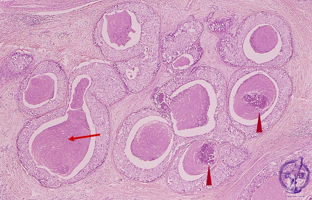 Microscopic image(HE stain, low power view):Intraductal spreading carcinoma demonstrating comedo-like central necrosis within cell nests. Sometimes necrosis accompanied by calcification (arrow head).