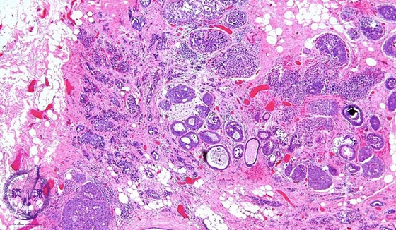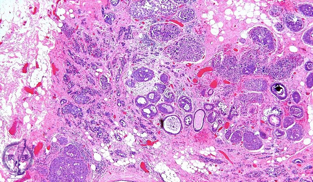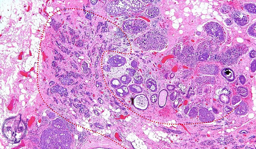 Microscopic image(HE stain, low power view):An example of well-differentiated type of invasive ductal carcinoma showing duct formation and/or papillary proliferation. In addition to intraductal spread, extensive stromal invasion (dotted line) is also apparent.