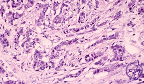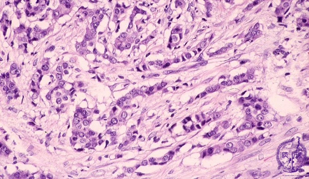 Microscopic image(HE stain, high power view):Marked tumor infiltration has evoked reactive stromal fibrosis. This cancer termed gscirrhoush cancer and is classified as a poorly differentiated ductal carcinoma. Infilatration of small nests and cords of carcinoma cells is also observed.