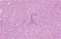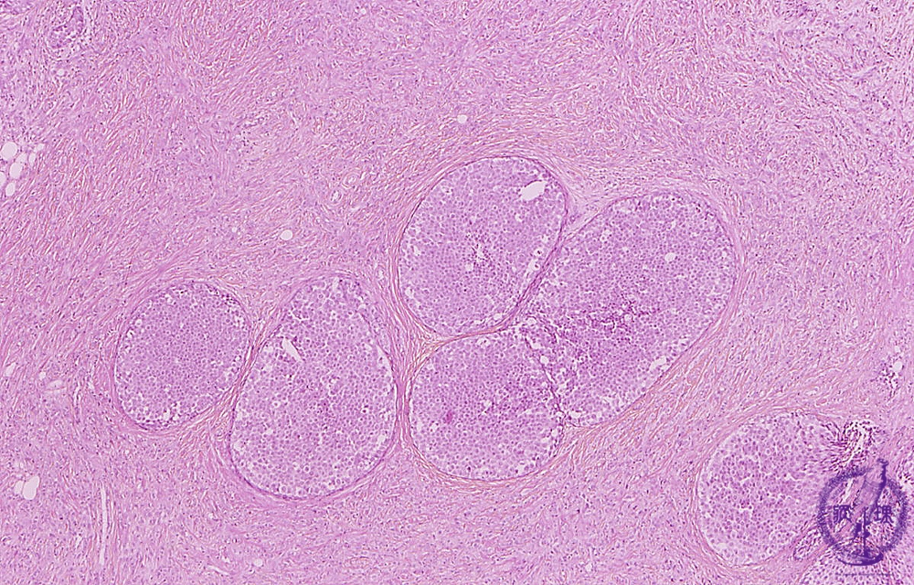 Microscopic image(HE stain, low power view):Tumor cells are found in a solid manner in the center of the lesion and diffusely infiltrated into adjacent stroma. Stromal invasion unclear at low power view.