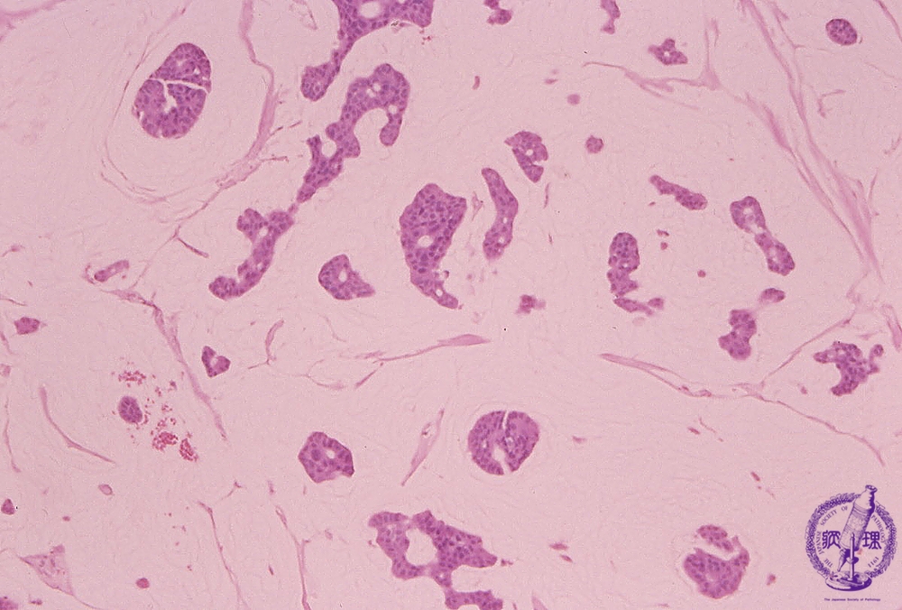 Microscopic image(HE stain, middle power view):Carcinoma cell groups floating in mucin lake. All bright space around cell group fills with mucous. This overproduction of mucous, in vast excess of the number of tumor cell, is indicative of the cells increased mucous production.