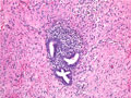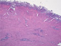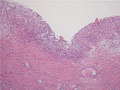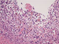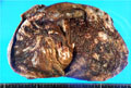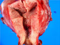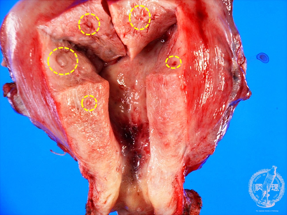 Macroscopic appearance (unfixed specimen): Several small cystic lesions with hemorrhage scattered in the thickened myometrium (yellow dotted line).