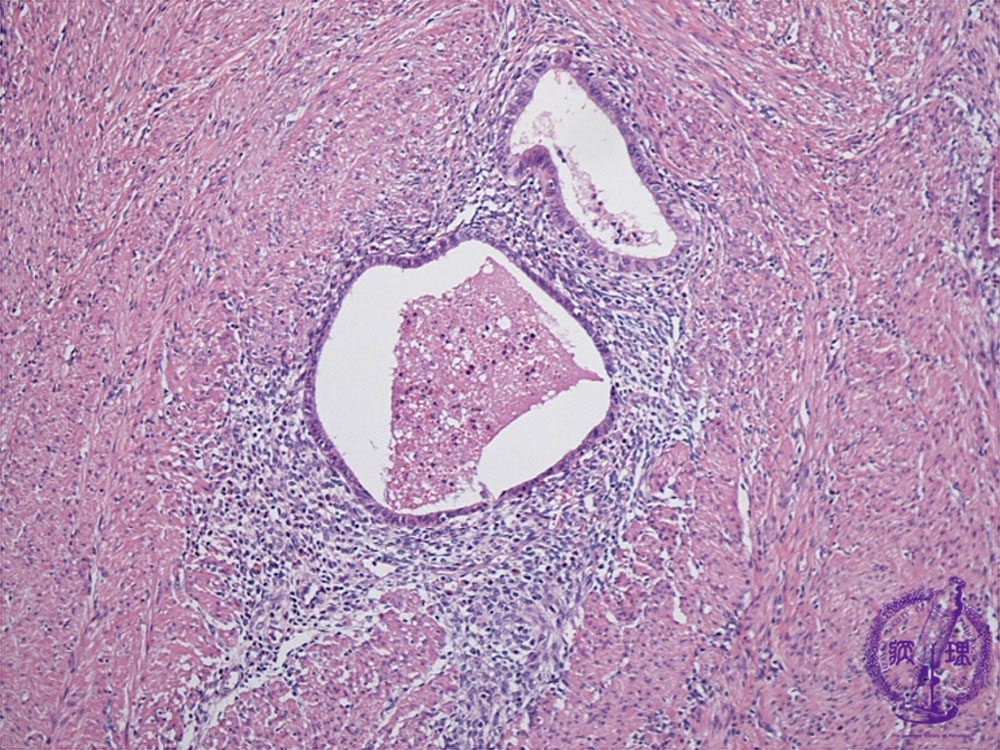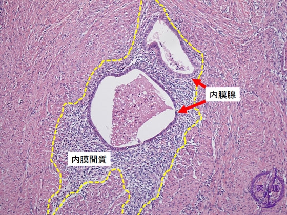 Histology (HE stain, intermediate power): Endometrial tissue consisting of endometrial glands and stromal cells in the myometrium.