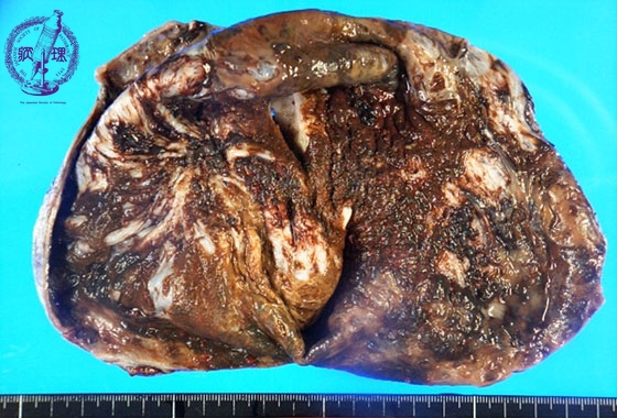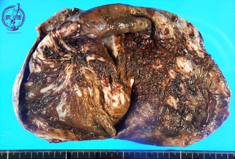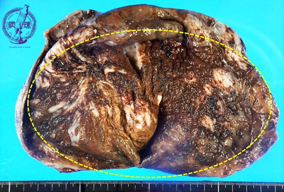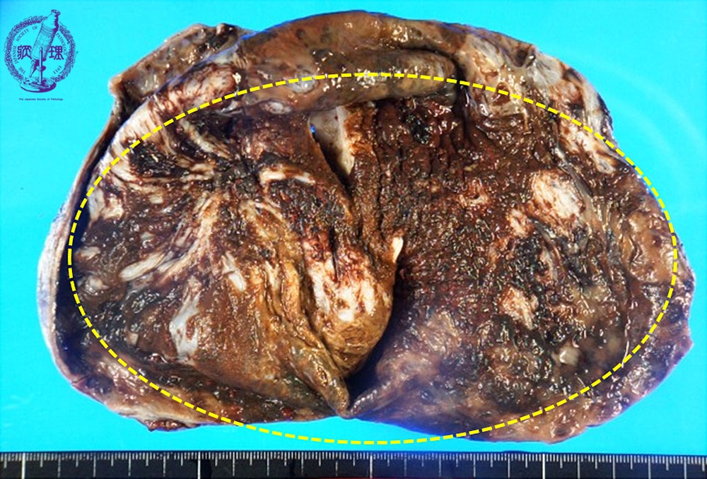 Macroscopic appearance: Endometriotic cyst. In endometriosis, cystic lesions with chocolate colored contents are often formed, and thus this is sometimes termed chocolate cysts (yellow dotted line)