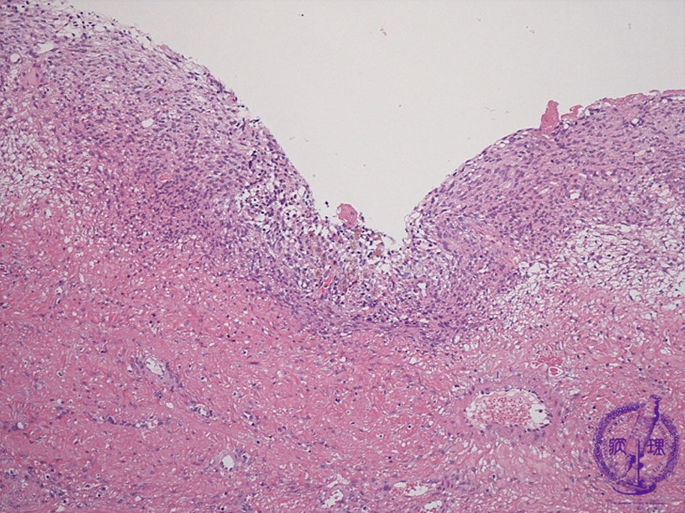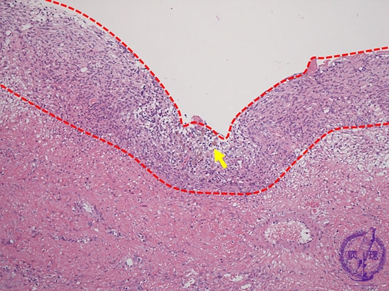 Histology (HE stain, low power): Ectopic endometrial tissue (stromal tissue), hemorrhage and hemosiderin-laden macrophages are apparent in the cyst wall (endometrial tissue: red dotted line, macrophages: yellow dotted line).