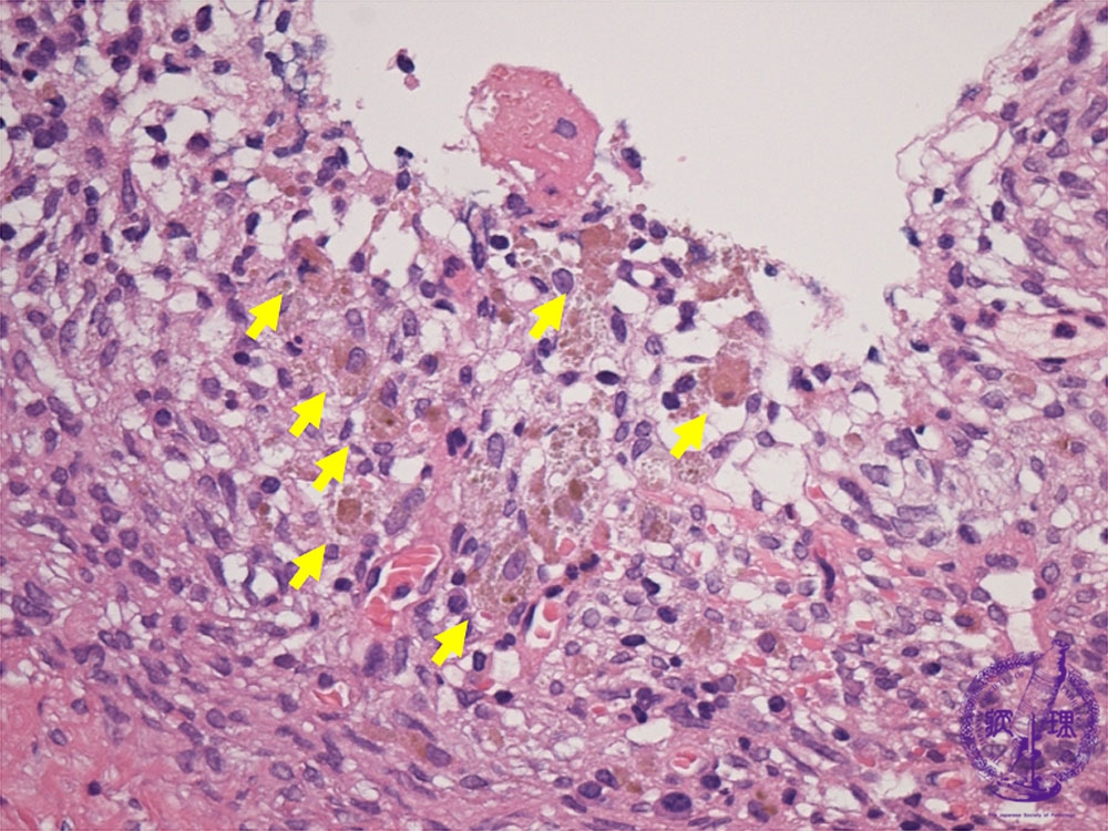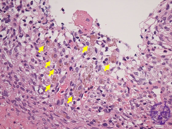Histology (HE stain, high power): Endometrial stromal tissue and numerous hemosiderin-laden macrophages (yellow arrow) in the cyst wall.