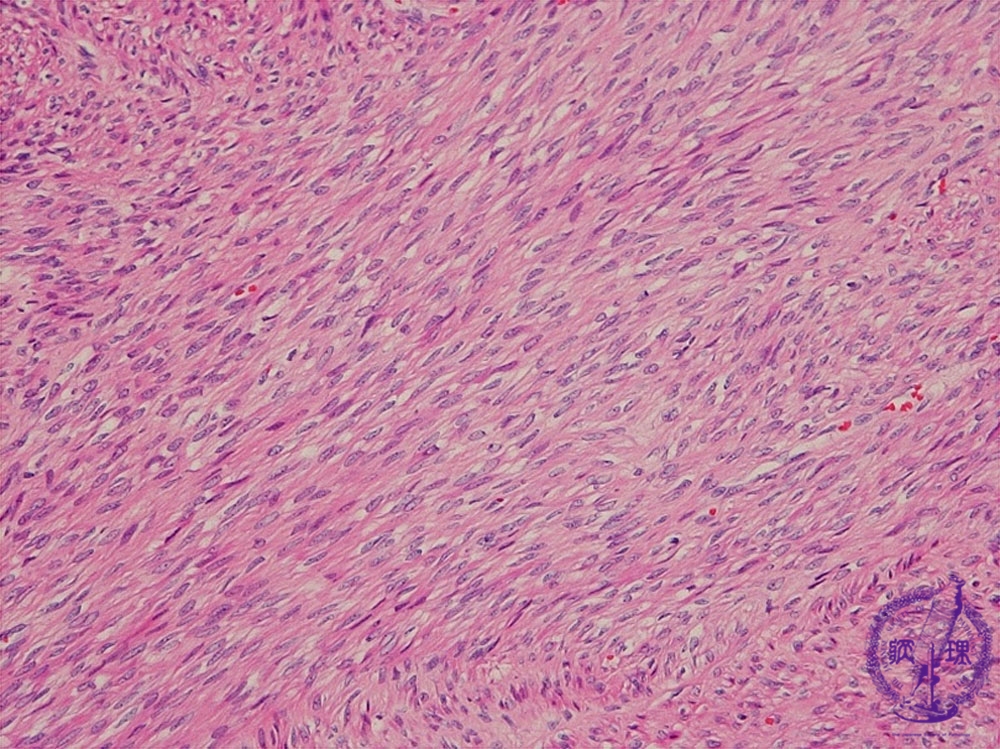 Histology (HE stain, intermediate power): Smooth muscle-like spindle tumor cells formed in an intricate fascicle pattern.