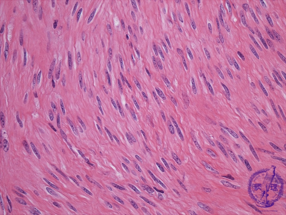 Histology (HE stain, high power): The tumor nuclei are long and ellipsoid (cigar-like). No mitotic figure or coagulation necrosis are identified.