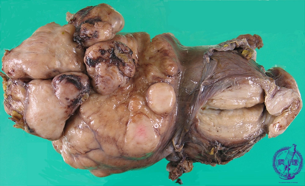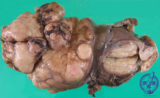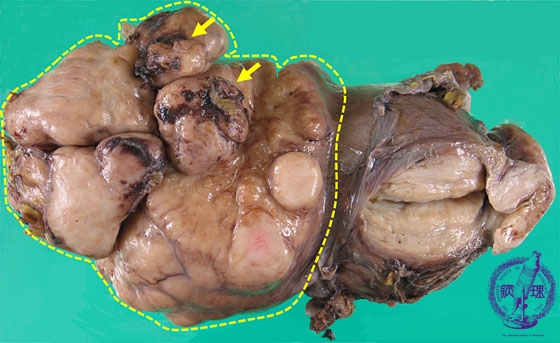 Macroscopic appearance: A milky white colored and solid tumor (yellow dotted line) with partial hemorrhage and necrosis (yellow arrow).