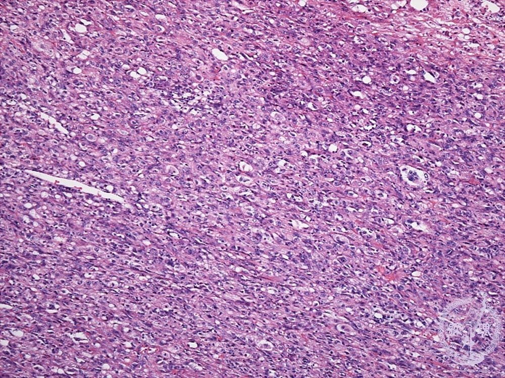 Histology (HE stain, low power): Spindle-shaped tumor cells with oval nuclei that proliferate in a solid fashion.