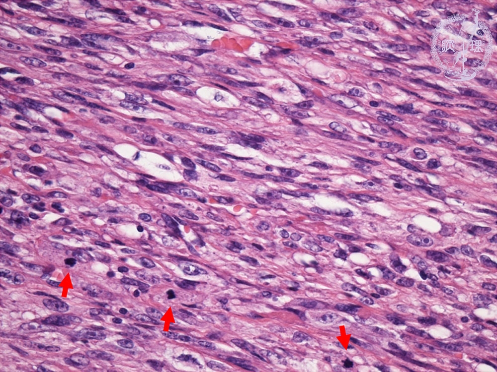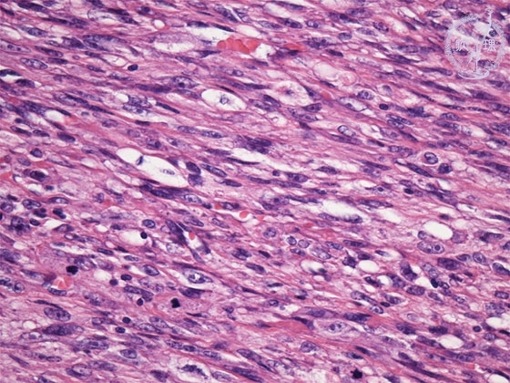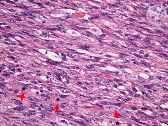 Histology (HE stain, high power): Higher nuclear density, larger nuclei, more irregular nuclei and mitotic figures compared to leiomyoma,