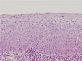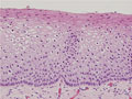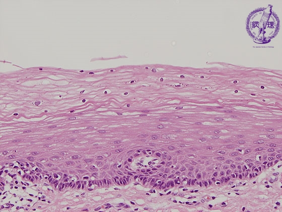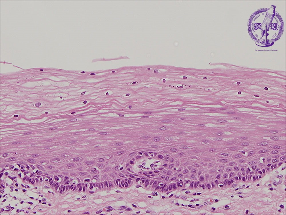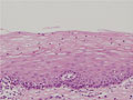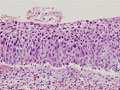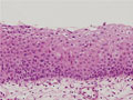 Histology (HE stain, high power): Intact cervical mucosa. The differentiation from basal to surface layer is evident. No atypical cells or koilocytosis apparent.