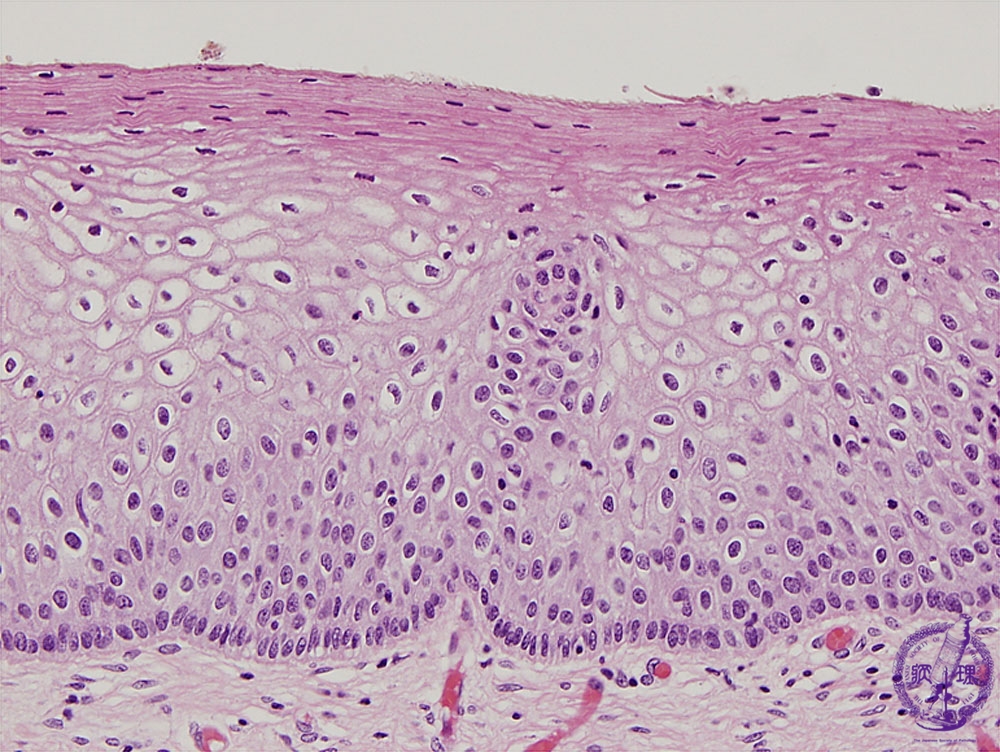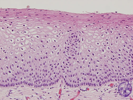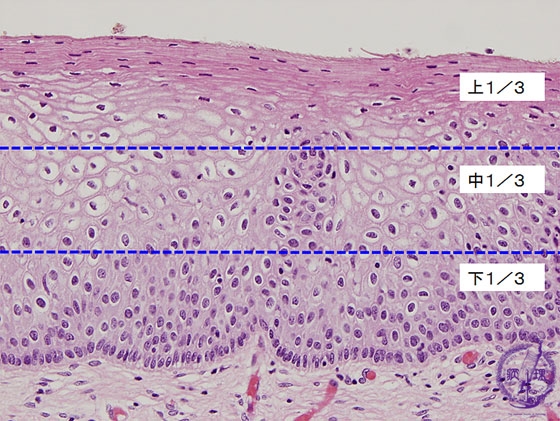 Histology (HE stain, high power): Mild dysplasia (CIN1). Koilocytosis is identifyied on surface side of the epithelium. Cells with mild atypia are observed from the basement membrane to 1/3 thickness of the epithelium.