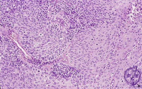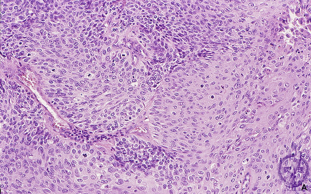 Histology (HE stain, high power): Squamous cell carcinoma of the uterine cervix. Non-keratinizing squamous cell carcinoma without keratin cancer pearls is typical of this malignancy.