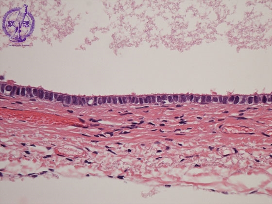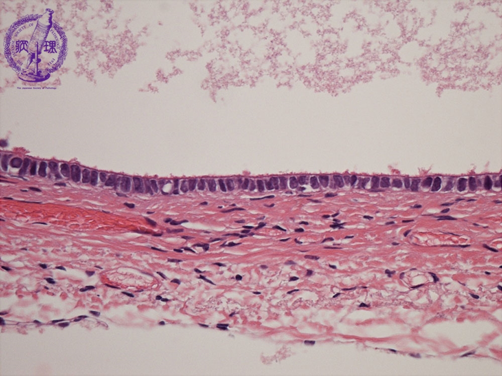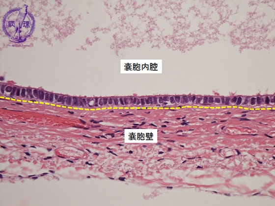 Histology (HE stain, high power): Serous cystadenoma of the ovary. Single layer of ciliated columnar cells (yellow dotted line) in inner surface of cyst.