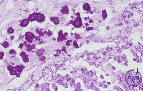 Histology (HE stain, high power): Serous cystadenocarcinoma of the ovary. Calcium deposition called psammoma body can sometimes be identified.