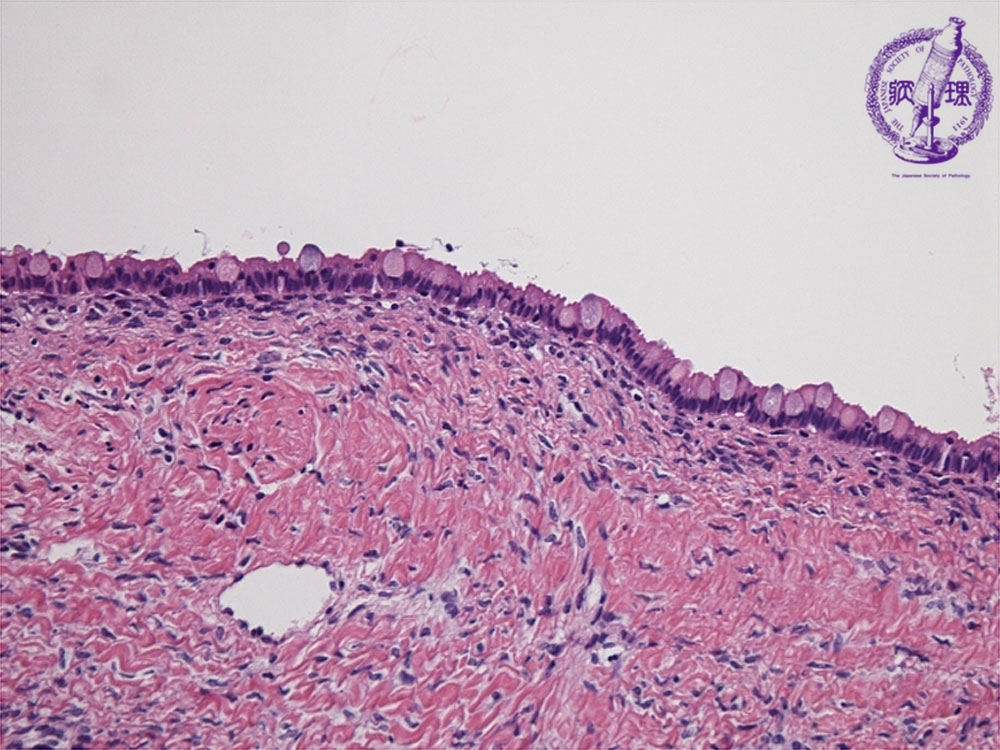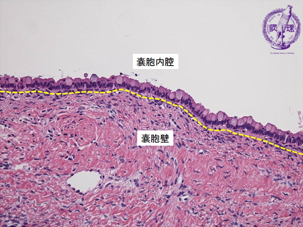 Histology (HE stain, high power): Single layer of columnar cells (yellow dotted line) in inner surface of cyst. The cells with clear cytoplasm and the nuclei are located at the side of basement membrane.