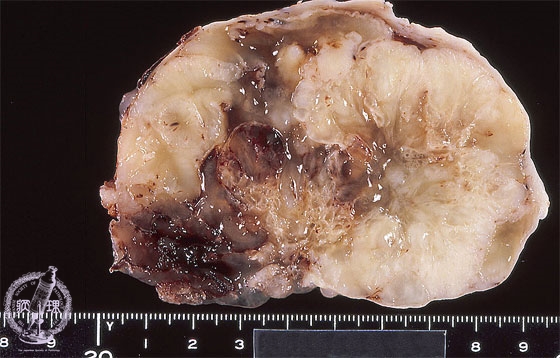 Macroscopic appearance: On cut surface, solid tumor occupied intracystic cavity (yellow dotted line). Due to abundant mucous component, cut surface also has glossy appearance.