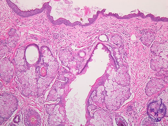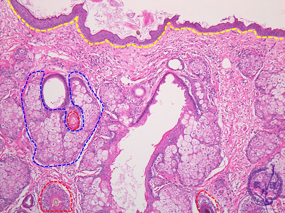 Histology (HE stain, low power): Mature cystic teratoma (dermoid cyst). Epidermis (yellow dotted line) or follicles (red dotted line) and sebaceous glands (blue dotted line) as skin appendages are apparent.