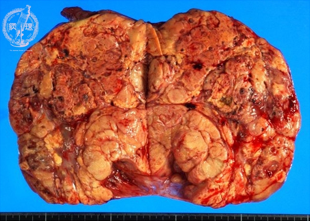 Macroscopic appearance (unfixed specimen): Yellow solid tumor on cut surface.