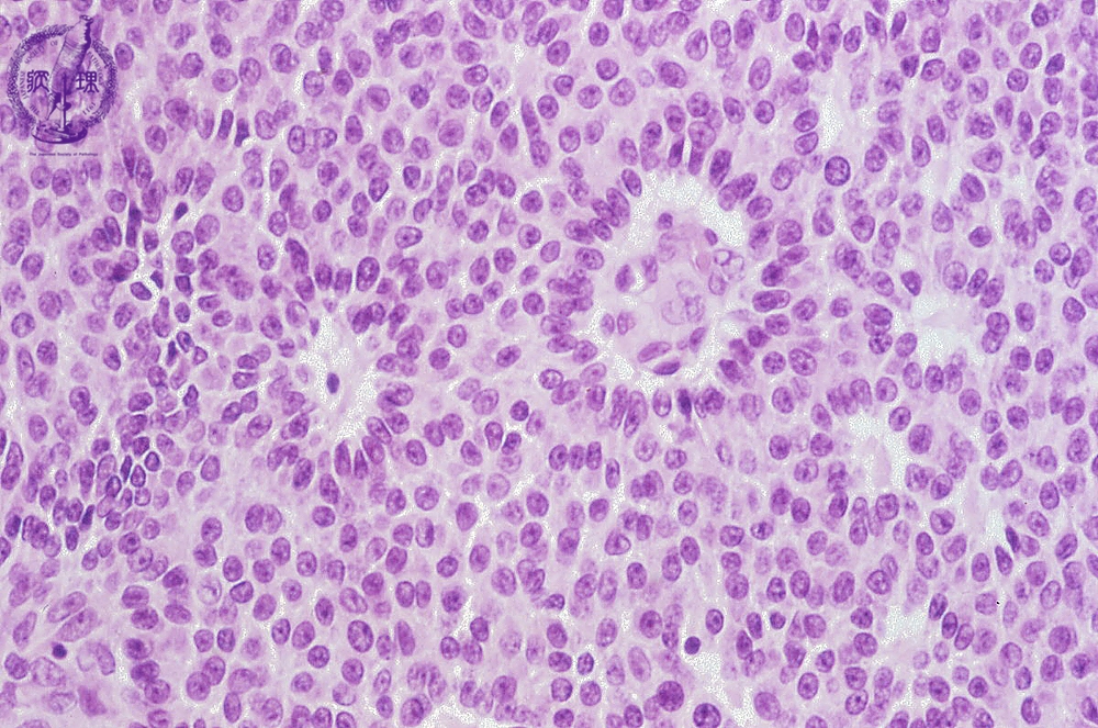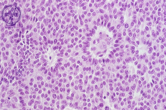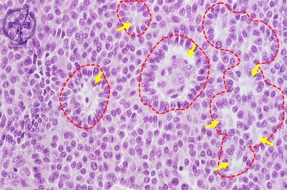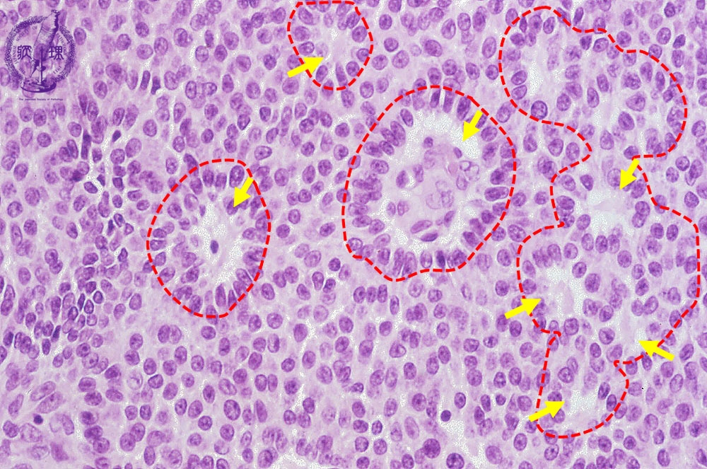 Histology (HE stain, high power): Tumor cells with nuclear groove shows solid growth. Tube-like structure (red dotted line) and numerous Call-Exner bodies (yellow arrow) are identifiable.