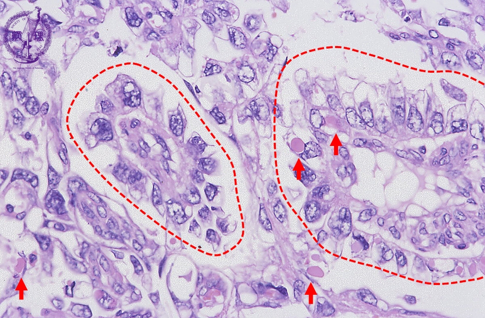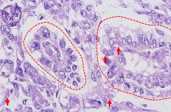 Histology (HE stain, high power): Perivascular arrangement of tumor cells (Schiller-Duval body, red dotted line) and eosinophilic rounded structure called hyaline globules (red arrow).