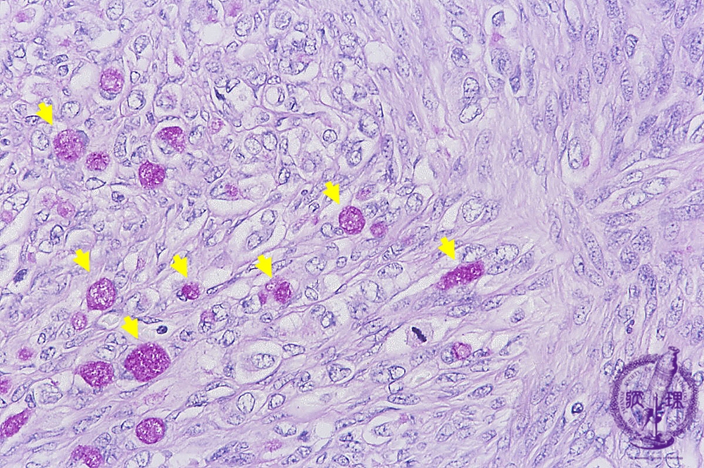 Histology (PAS stain with diastase digestion, high power): Mucin of signet-ring cells was stained in red-purple.