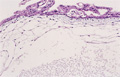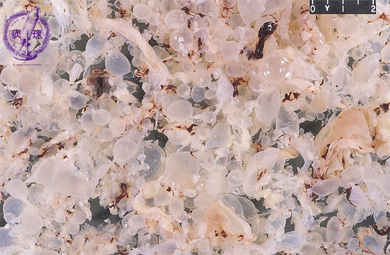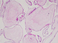 Macroscopic appearance: Almost all of villi shows cystic dilation and most of them larger than 2 mm in their shortest diameter (yellow dotted line).