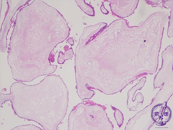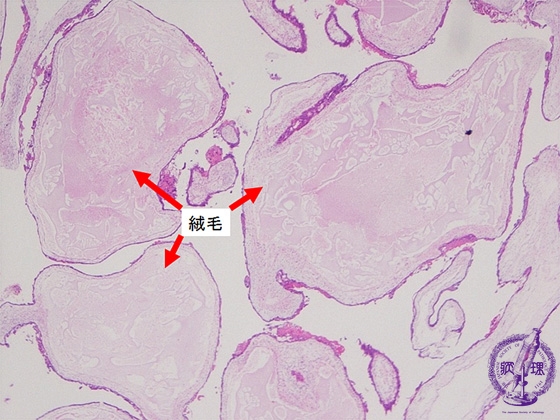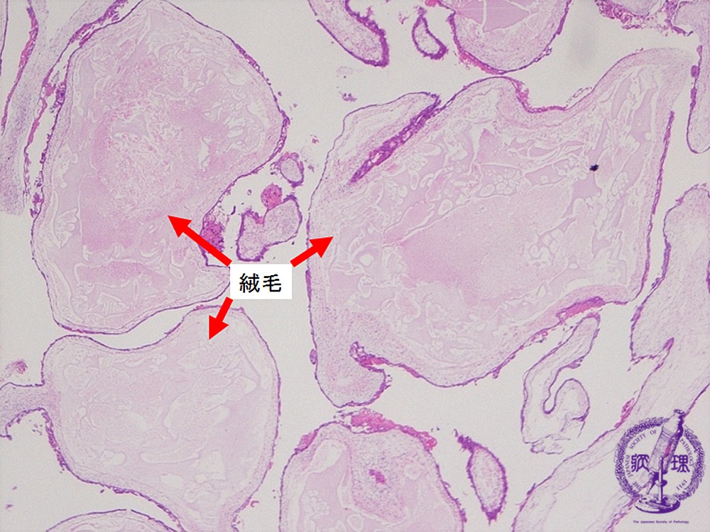 Histology (HE stain, low power): Villi (arrow) enlarged in edematous appearance without interstitial vasculature. Mild proliferation of trophoblasts could be identified here.
