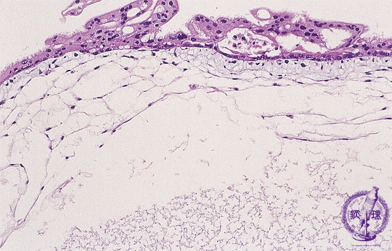 Histology (HE stain, intermediate power): Villi enlarged in edematous appearance without interstitial vasculature. Mild proliferation of trophoblasts could be identified here.