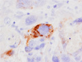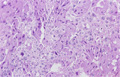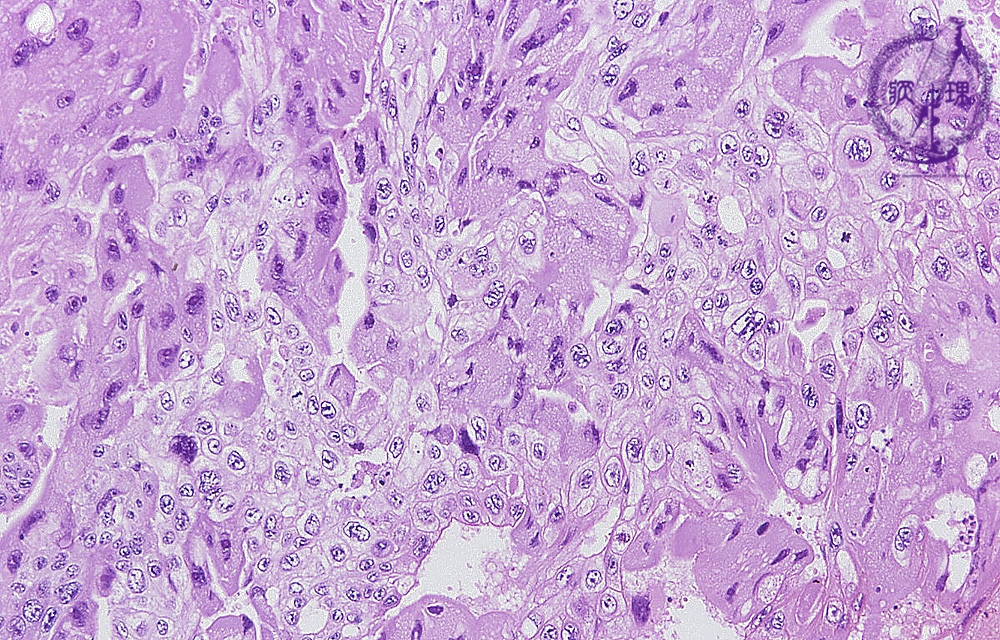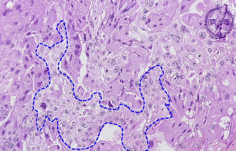 Histology (HE stain, low power):Multinucleated eosinophilic tumor cells mimicking syncytiotrophoblasts, (yellow dotted line) and tumor cells with clear cytoplasm mimicking cytotrophoblasts (blue dotted line) proliferate in sheet-like pattern. The former type of tumor cells produces and secretes human chorionic gonadotropin (h-CG) as identified by IHC (see below).