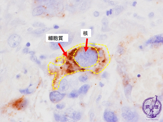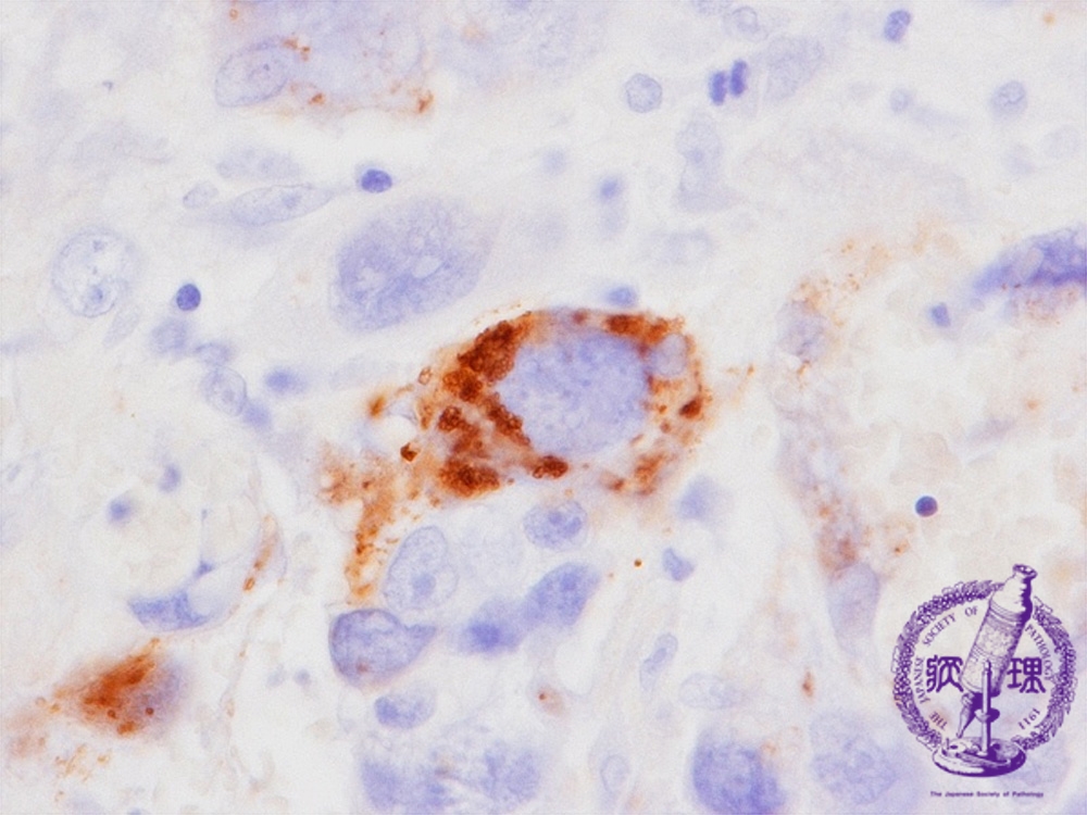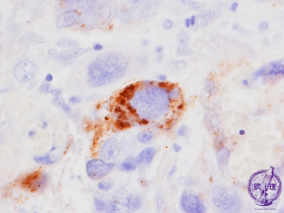 Histology (Immunohistochemistry, human chorionic gonadotropin (h-CG), high power): Cytoplasm of tumor cell immunohistochemically positive for h-CG.