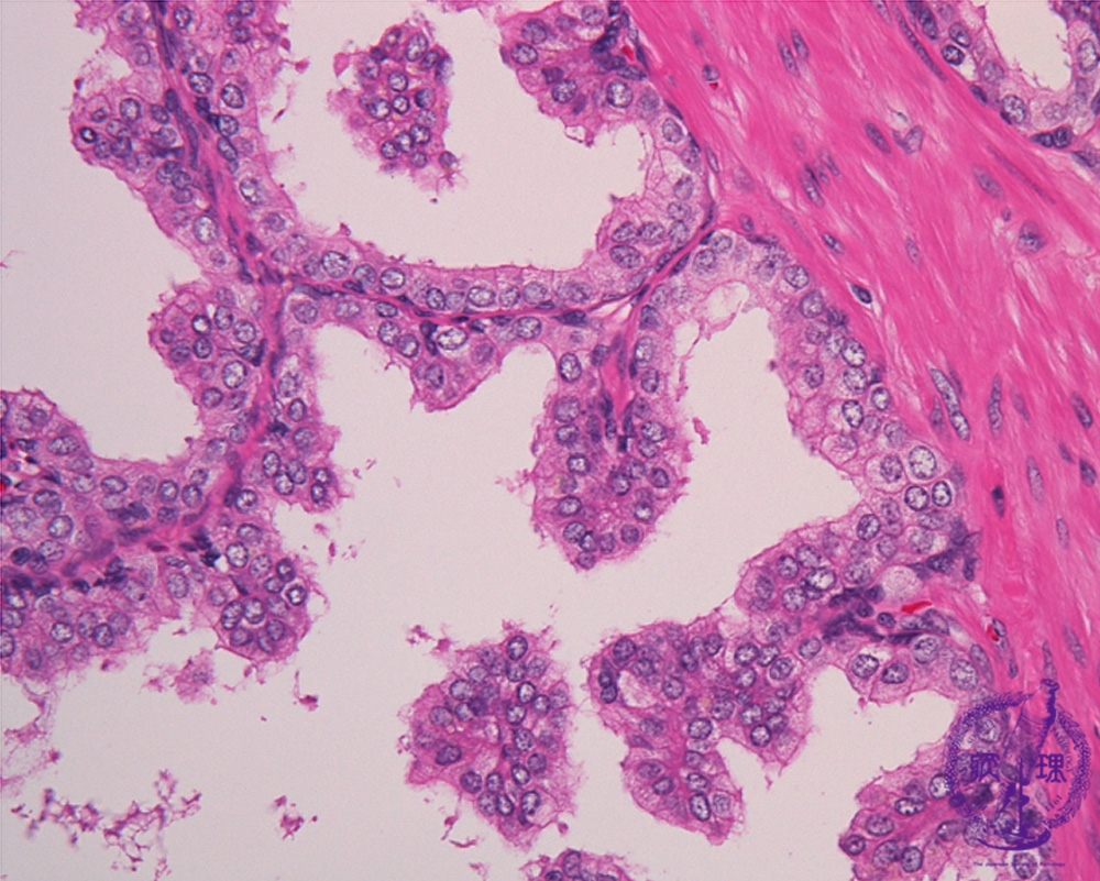 Histology (HE stain, high power): One of the most important features to differentiate prostatic carcinoma from hypertrophy is the structural layers of prostate epithelium. As shown here benign glands have a two layer structure consisting of inner secretory cells and outer basal cells.