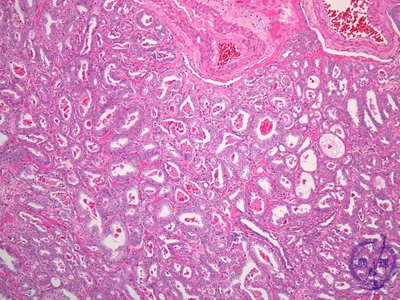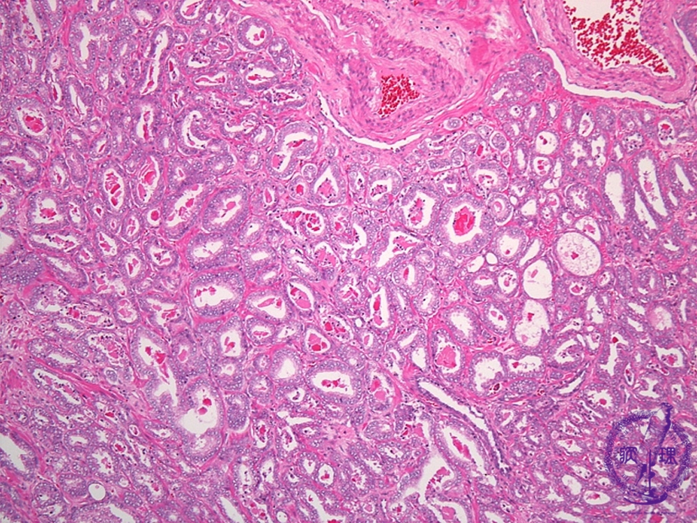 Histology (HE stain, intermediate power): Well differentiated adenocarcinoma. According to the degrees of tubular structure conservation, the histological degree of differentiation has been classified as well, moderately or poorly differentiated. However, at this juncture, Gleason grading system is common as a means of evaluating prognosis. The Gleason score of this case 6(3+3).
