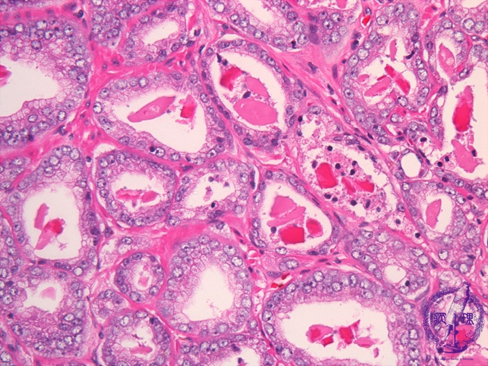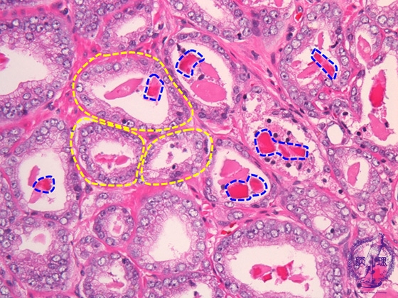 Histology (HE stain, high power): Well differentiated adenocarcinoma. In contrast to benign glands, carcinomatous glands usually consist of simple tubular structure (yellow dotted line) without two cell layer structures. Crystalloids (blue dotted line) are often identified in the tubules of well differentiated adenocarcinoma.