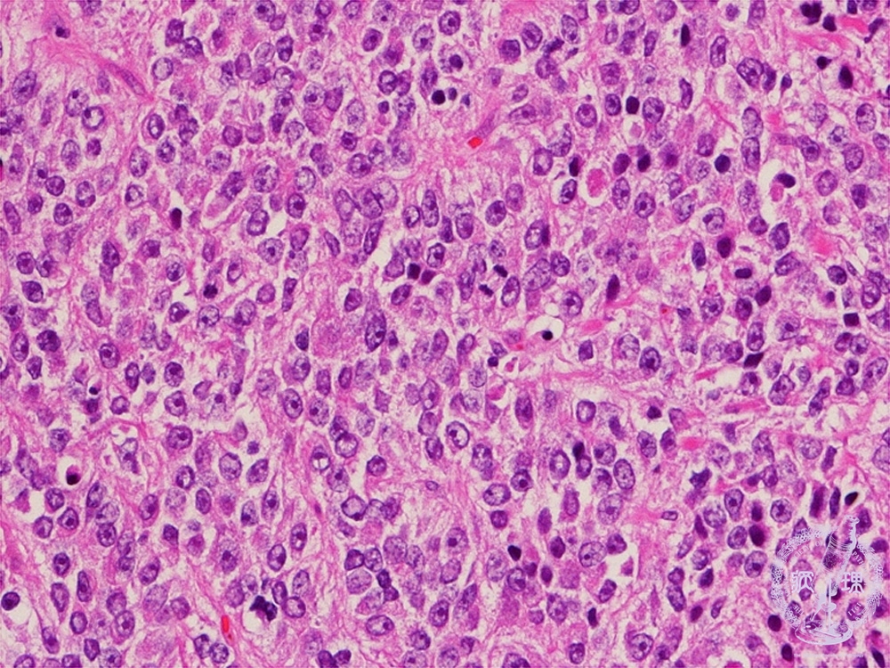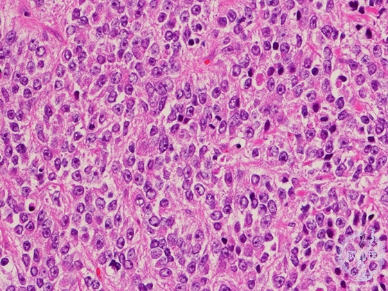 Histology (HE stain, high power): Poorly differentiated adenocarcinoma. Carcinoma cells proliferate in solid pattern, with almost no tubular formation.
